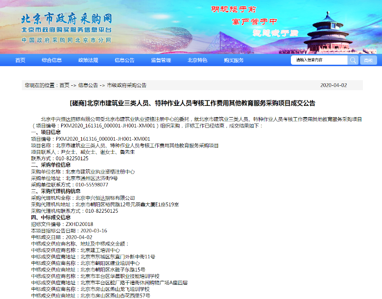 4月2日北京市政府采購網正式發布了《北京市建筑業三類人員、特種作業人員考核工作費用其他教育服務采購項目成交公告》,我校順利中標。我校承諾在接下來的北京市建筑業三類人員、特種作業人員考試組織承辦過程中,將一如既往的保持專業嚴謹的工作態度,向相關部門及考生提供良好的考試環境和服務。